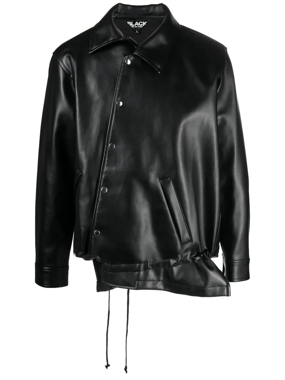 asymmetric-hem artificial leather jacket from BLACK COMME DES GARÇONS featuring black, artificial leather, asymmetric hem, off-centre front button fastening, classic collar and long sleeves.
