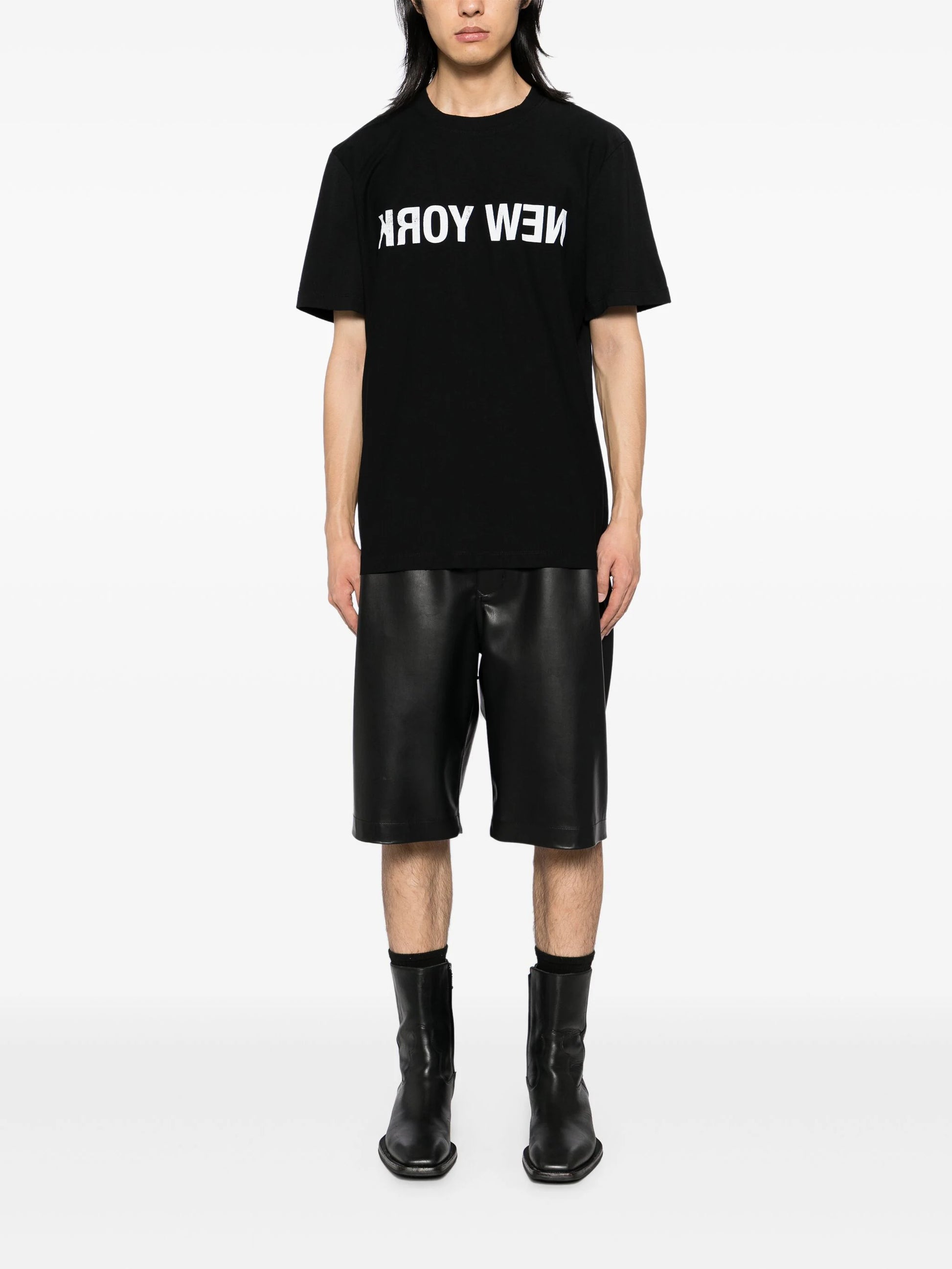 black cotton slogan print to the front decorative buckle detailing crew neck short sleeves straight hem