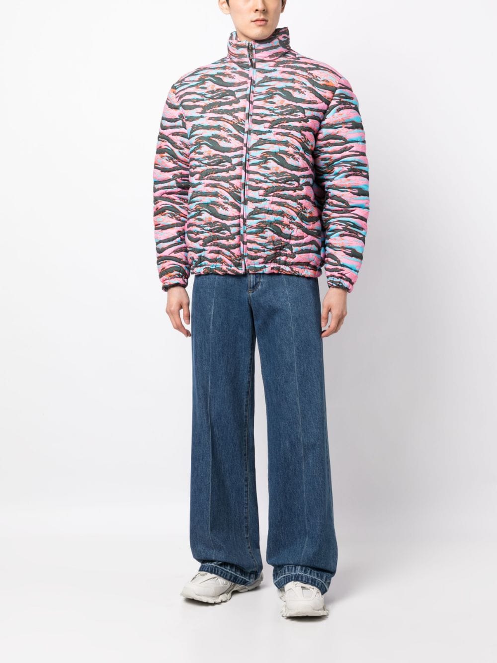 camouflage jacquard padded jacket from ERL featuring pink, multicolour, cotton, duck down, padded design, full jacquard, camouflage pattern, high neck, front zip fastening, long sleeves and elasticated hem. When buying this unisex item, keep in mind that it is graded in standard men's sizing..