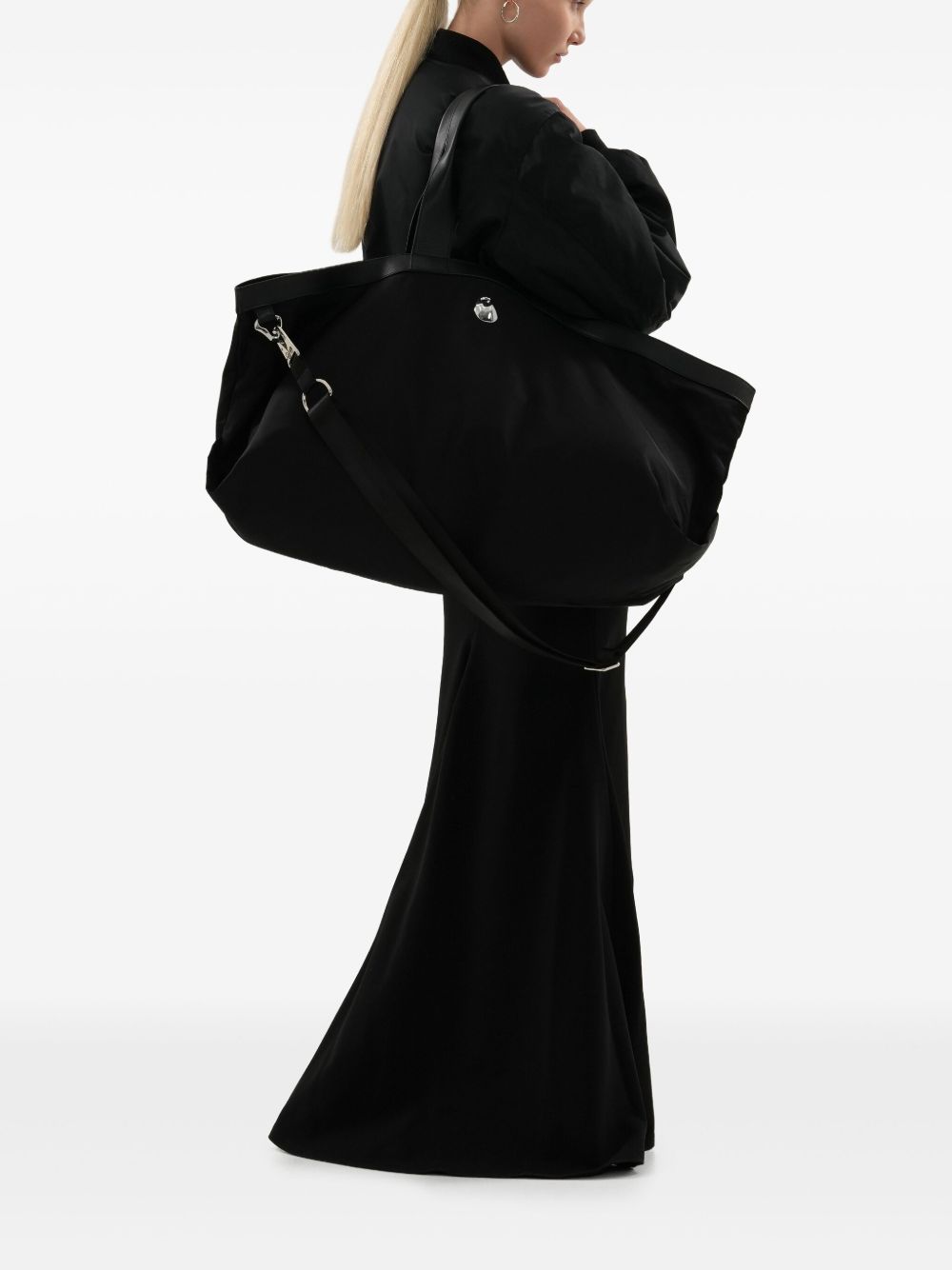 black dual top handles detachable shoulder strap logo charm detail spacious main compartment sleek design