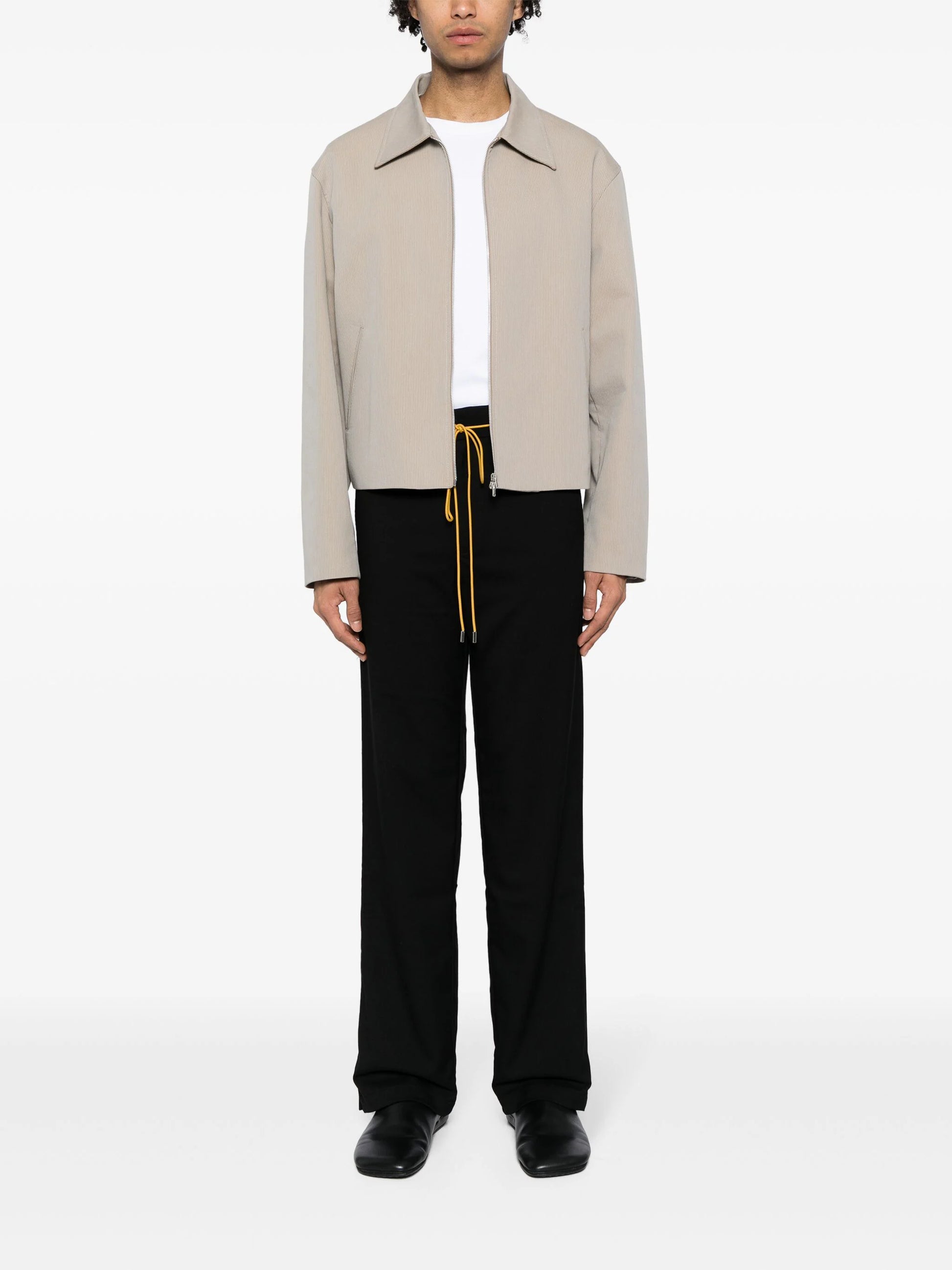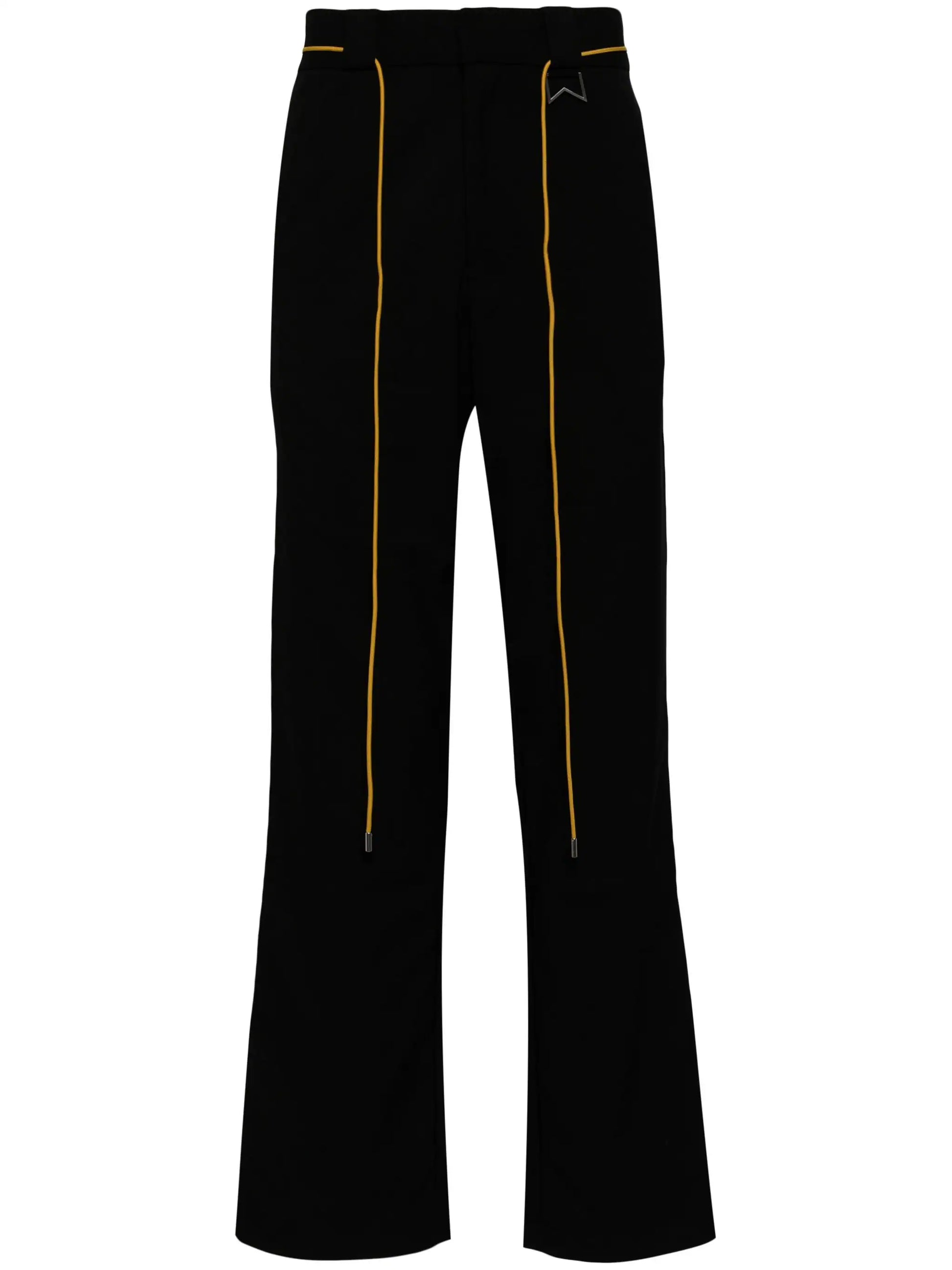 black chevron D-ring findings concealed front fastening drawstring waist belt loops two side slit pockets rear patch pocket straight leg
