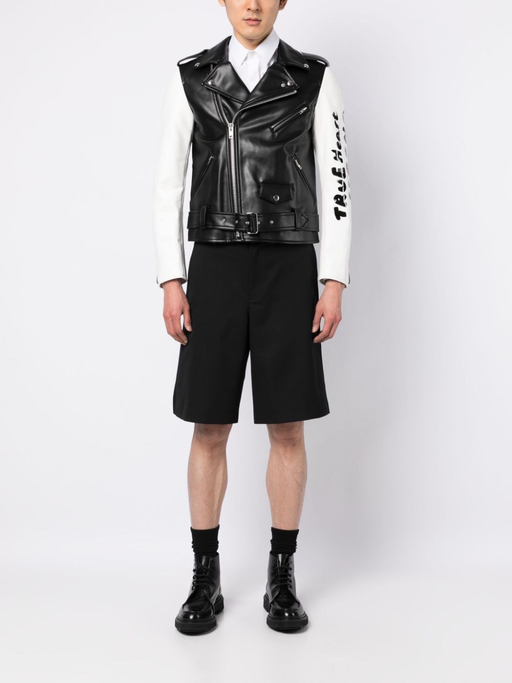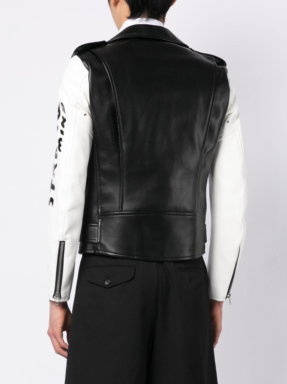 contrasting-sleeves biker jacket from BLACK COMME DES GARÇONS featuring black/white, Bemberg™ cupro, graphic-print sleeves, contrasting-fabric sleeves, epaulettes, notched lapels, off-centre front zip fastening, belted waist, long sleeves, cuff zips, front flap pocket and multiple zip-fastening pockets. When buying this unisex item, keep in mind that it is graded in standard men's sizing..