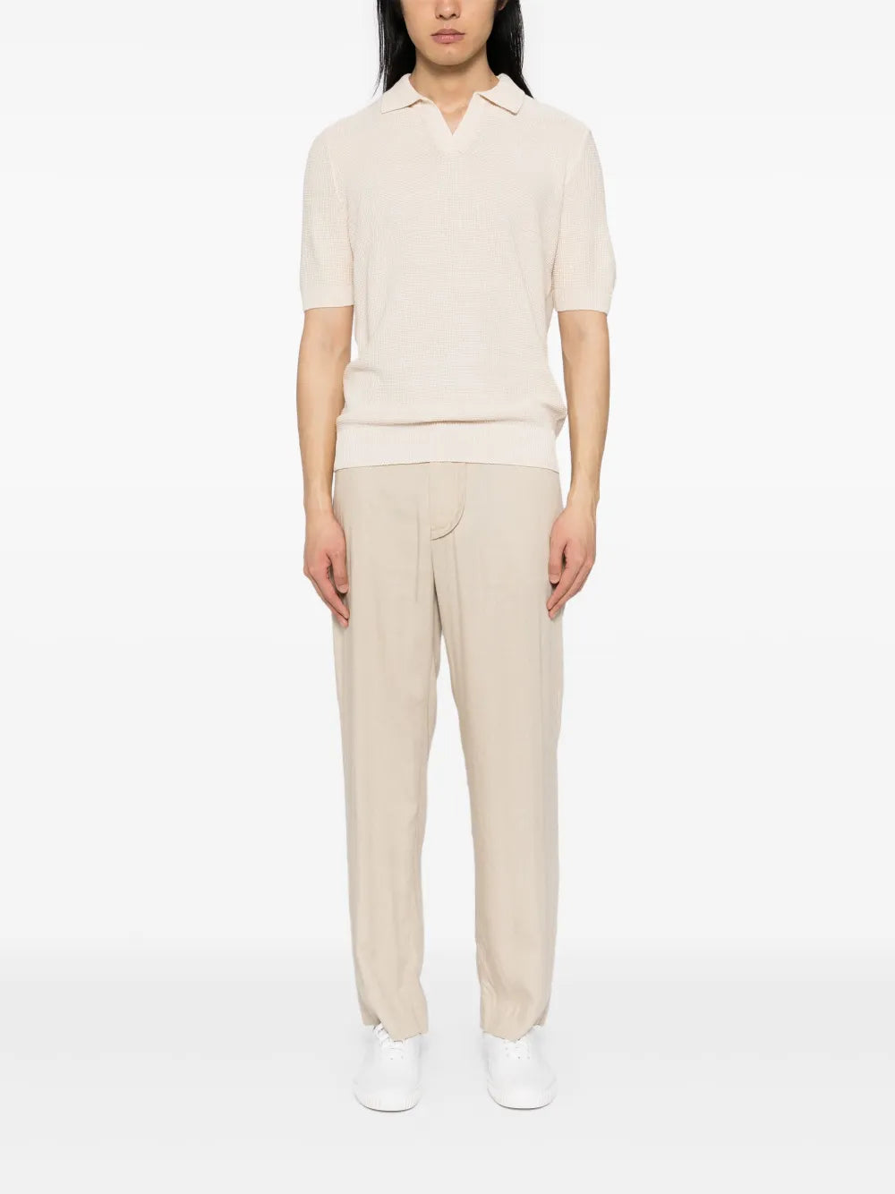 Expertly crafted from high-quality knit fabric, this Knitted Polo Shirt features a light beige polo collar and ribbed cuffs and hem for a comfortable and stylish fit. Perfect for any occasion, this shirt will add a touch of sophistication to your wardrobe.