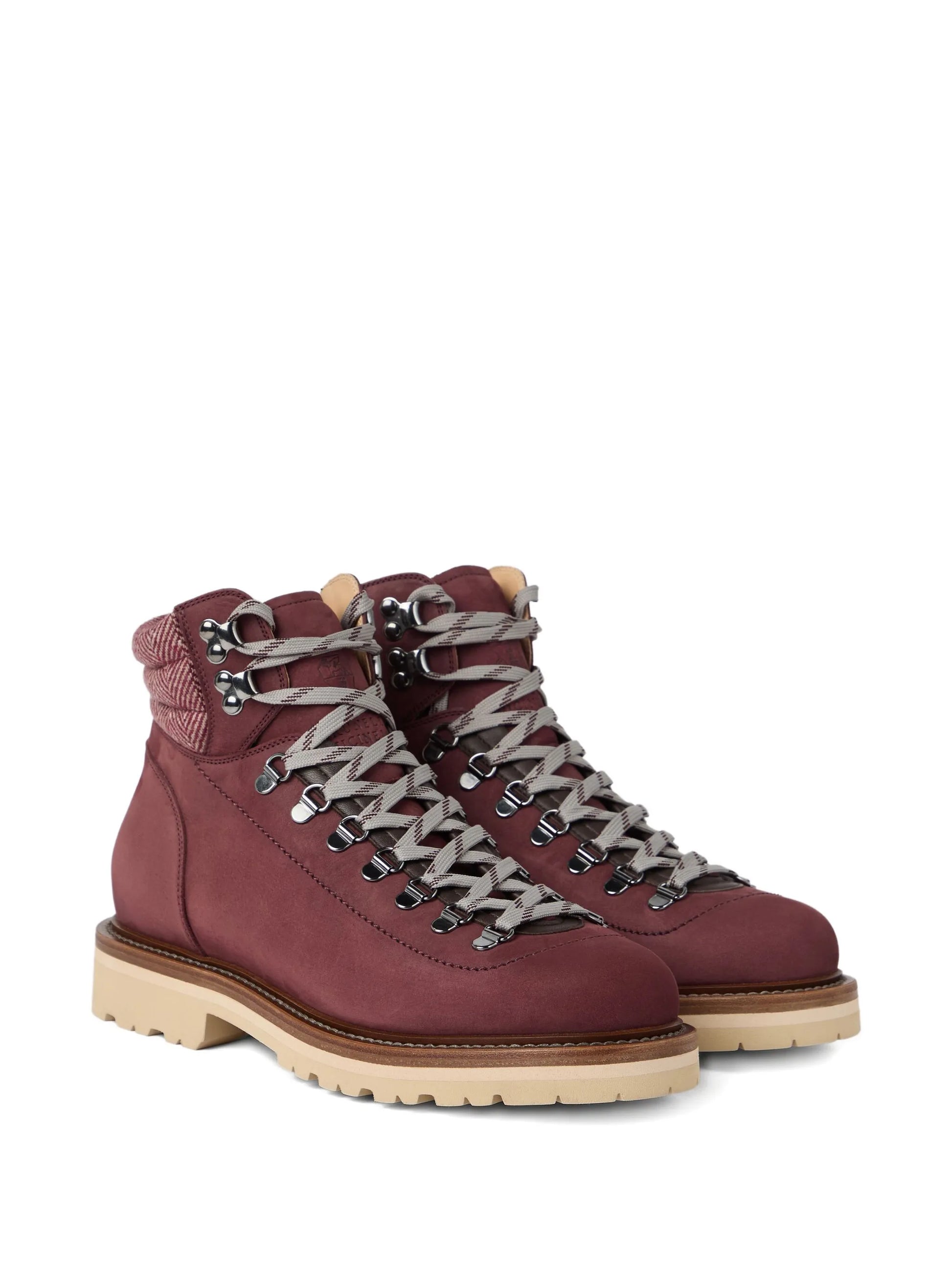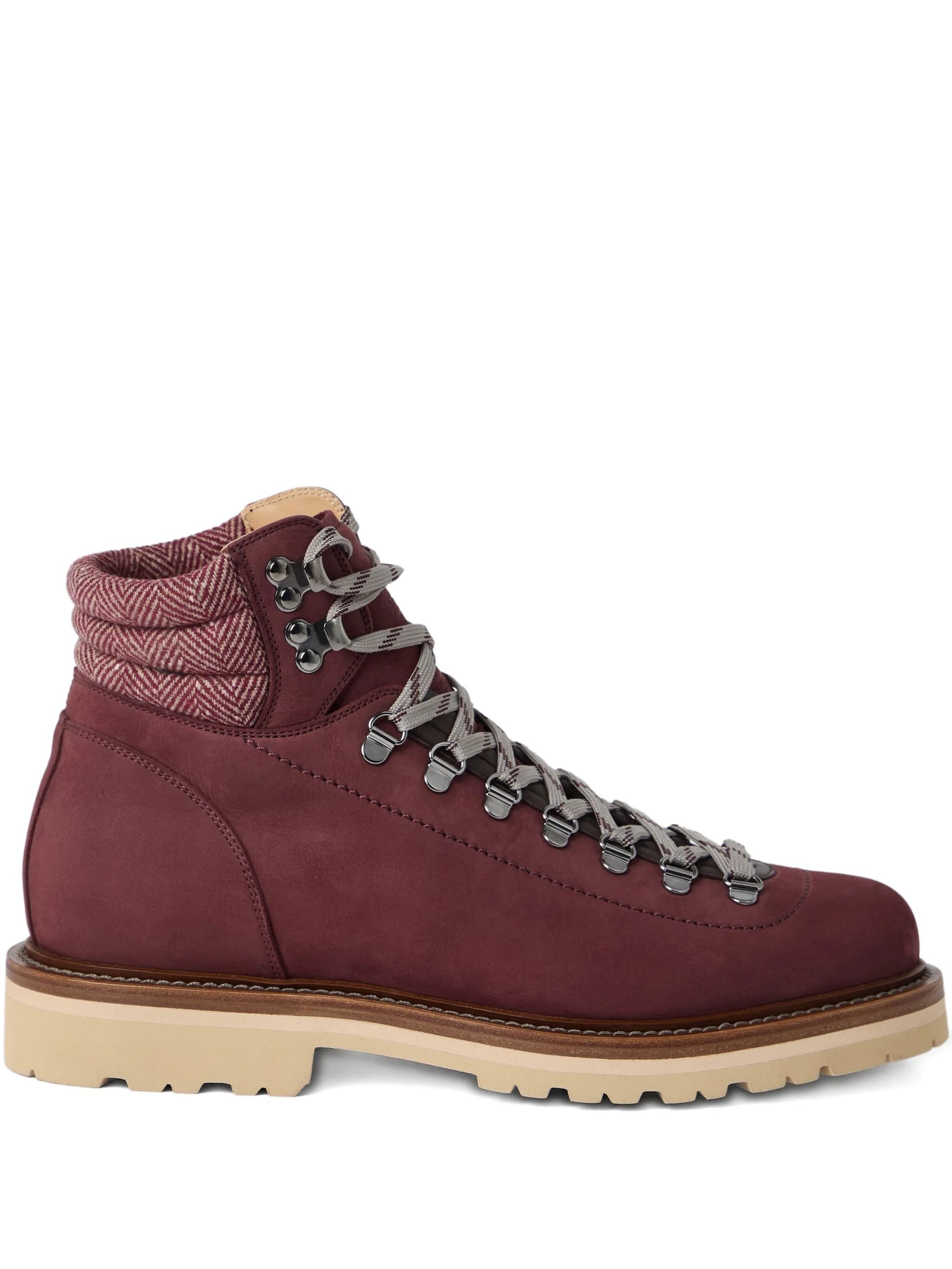 These Lace-Up Herringbone-Detail Boots showcase a vibrant red upper with precise lace-up fastening secured through durable metal eyelets. The herringbone-patterned cuff adds a textured, sophisticated touch, while the rubber sole ensures reliable traction and comfort. Crafted for both style and functionality, these boots offer a refined yet practical option for everyday wear.