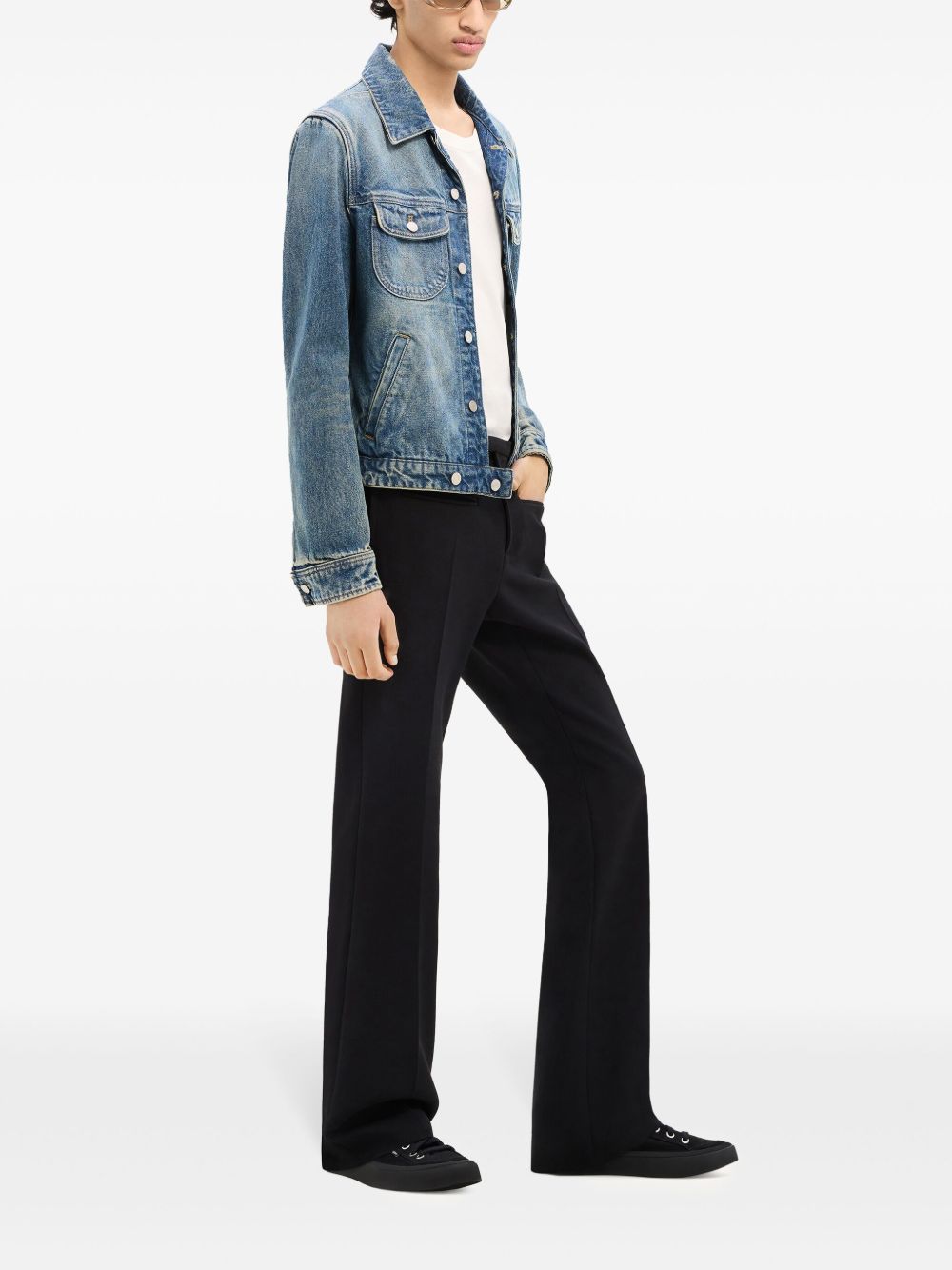Crafted from premium blue cotton denim with a distinctive stonewashed finish, this jacket delivers timeless style with contemporary edge. The spread collar and long sleeves with buttoned cuffs provide refined structure, while dual chest flap pockets and side welt pockets offer practical storage. A signature logo patch adorns the front, establishing brand presence. The adjustable waist strap allows customized fit, and the straight hem maintains clean proportions. Front button fastening ensures effortless wear. An essential layering piece that transitions seamlessly from casual to smart-casual settings.