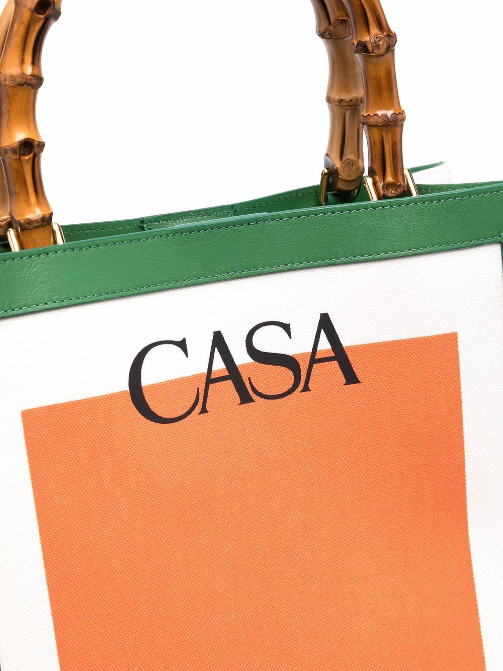 Green/orange/white leather/canvas logo-print bamboo-handle tote bag from CASABLANCA featuring logo print to the front, contrasting trim, signature bamboo top handles, detachable shoulder strap, open top and main compartment.