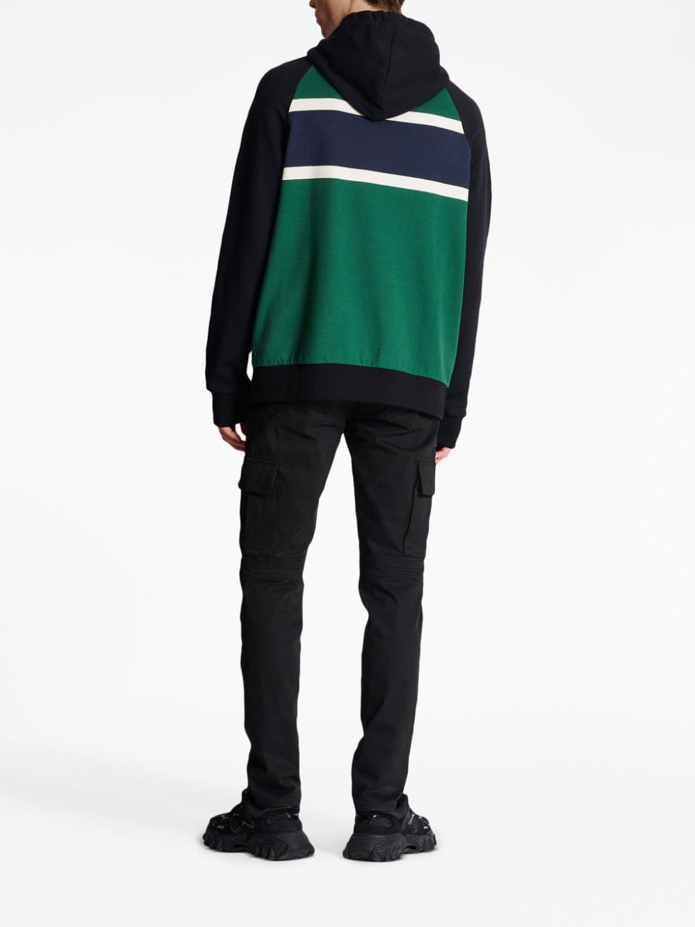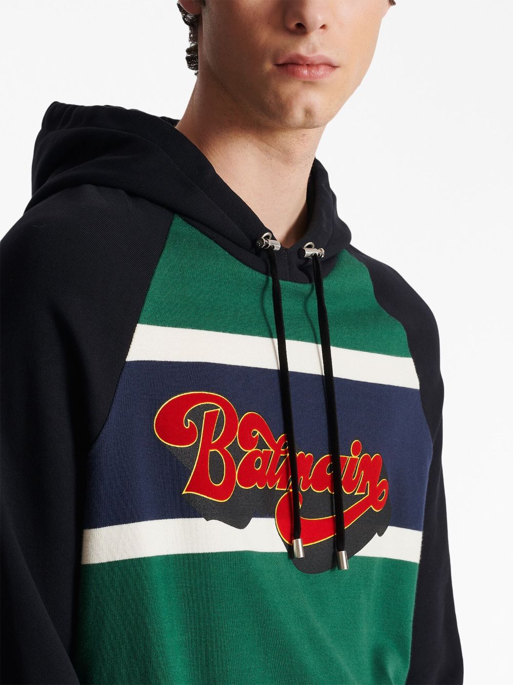 logo-print cotton hoodie from Balmain featuring multicolour, cotton, panelled design, stripe detailing, logo print to the front, drawstring hood, long sleeves, front pouch pocket, elasticated cuffs and straight hem.