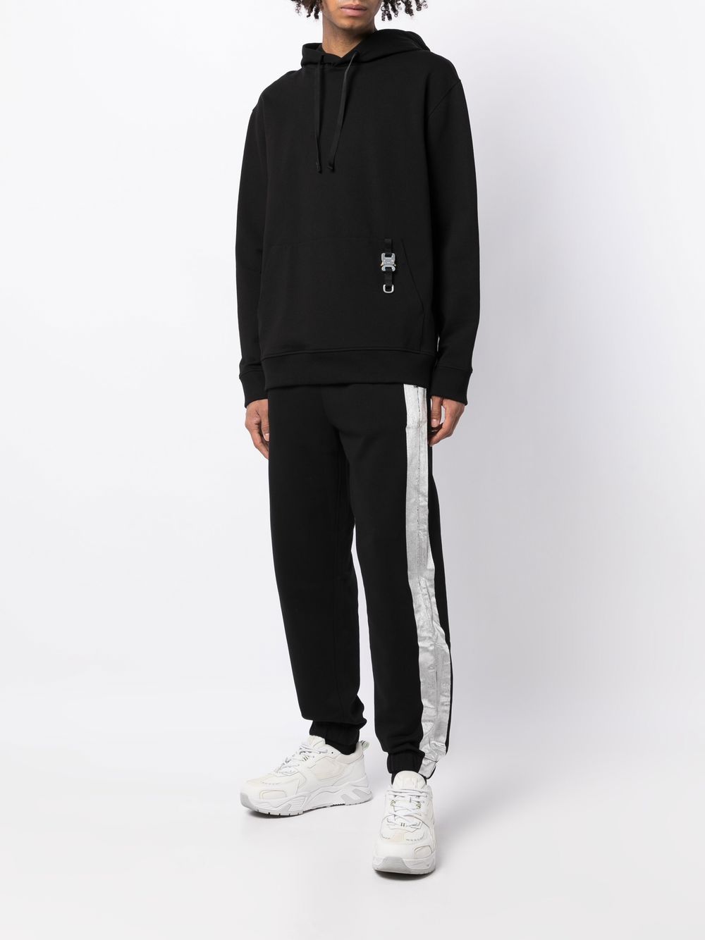 metallic-detail track pants from HELMUT LANG featuring jet black, cotton, jersey knit, metallic effect, side stripe detailing, elasticated waistband, two side slit pockets, tapered leg and elasticated ankles.