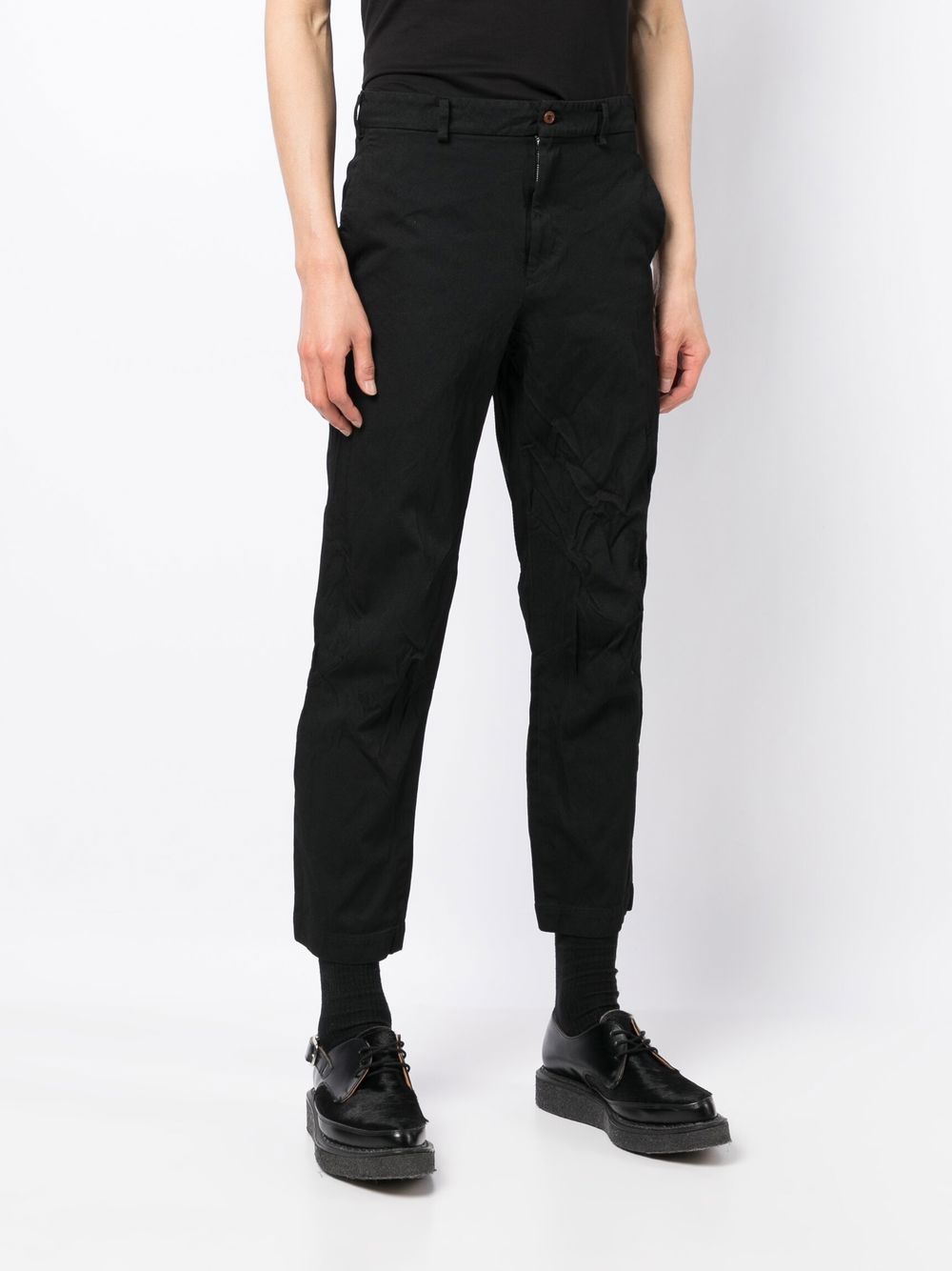 mid-rise cropped trousers from BLACK COMME DES GARÇONS featuring black, concealed fly and button fastening, belt loops, two side slit pockets, rear welt pocket, rear flap pocket and cropped leg.