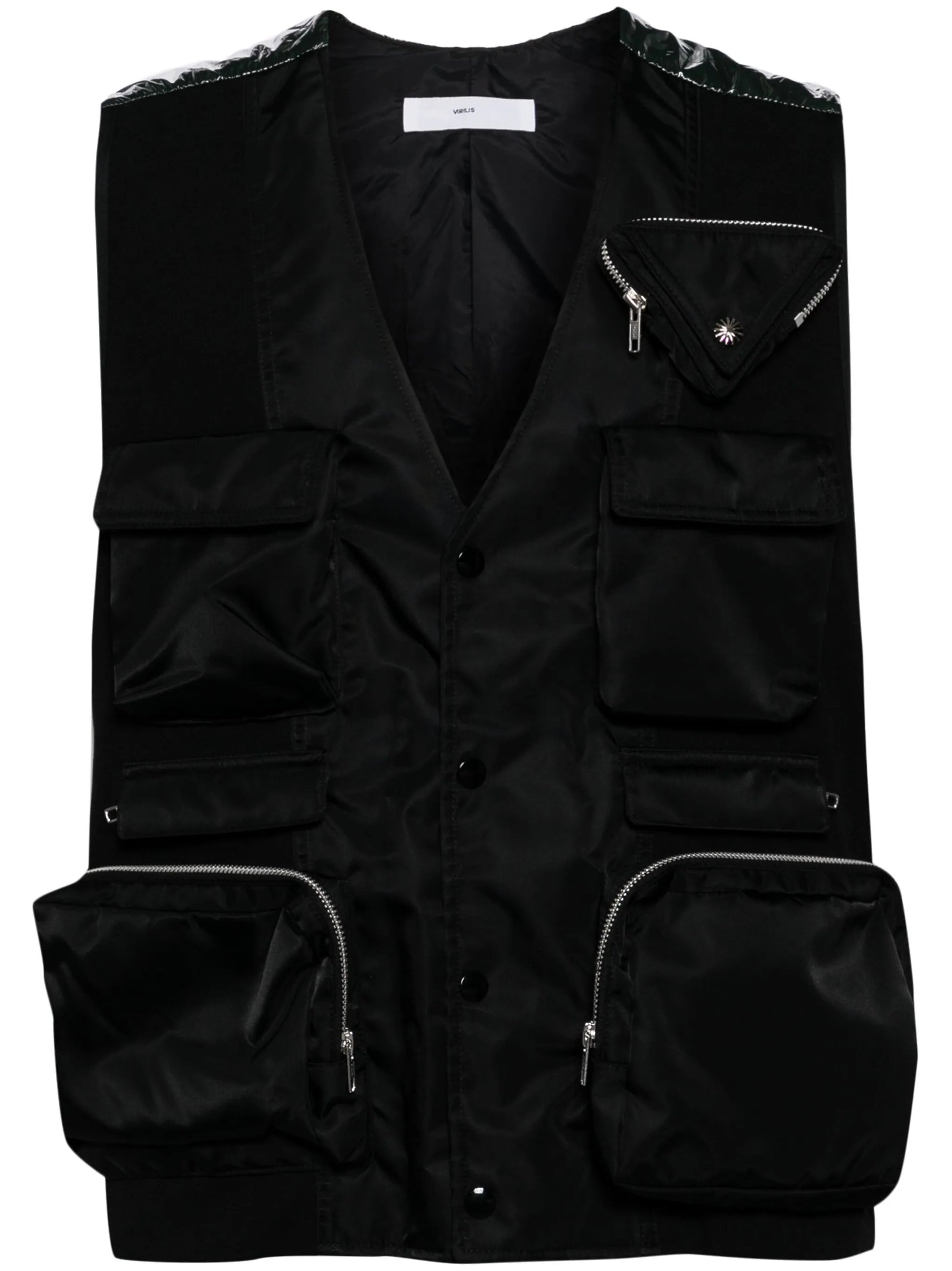black padded design satin finish padded panels V-neck front press-stud fastening multiple zip-fastening pockets sleeveless straight hem