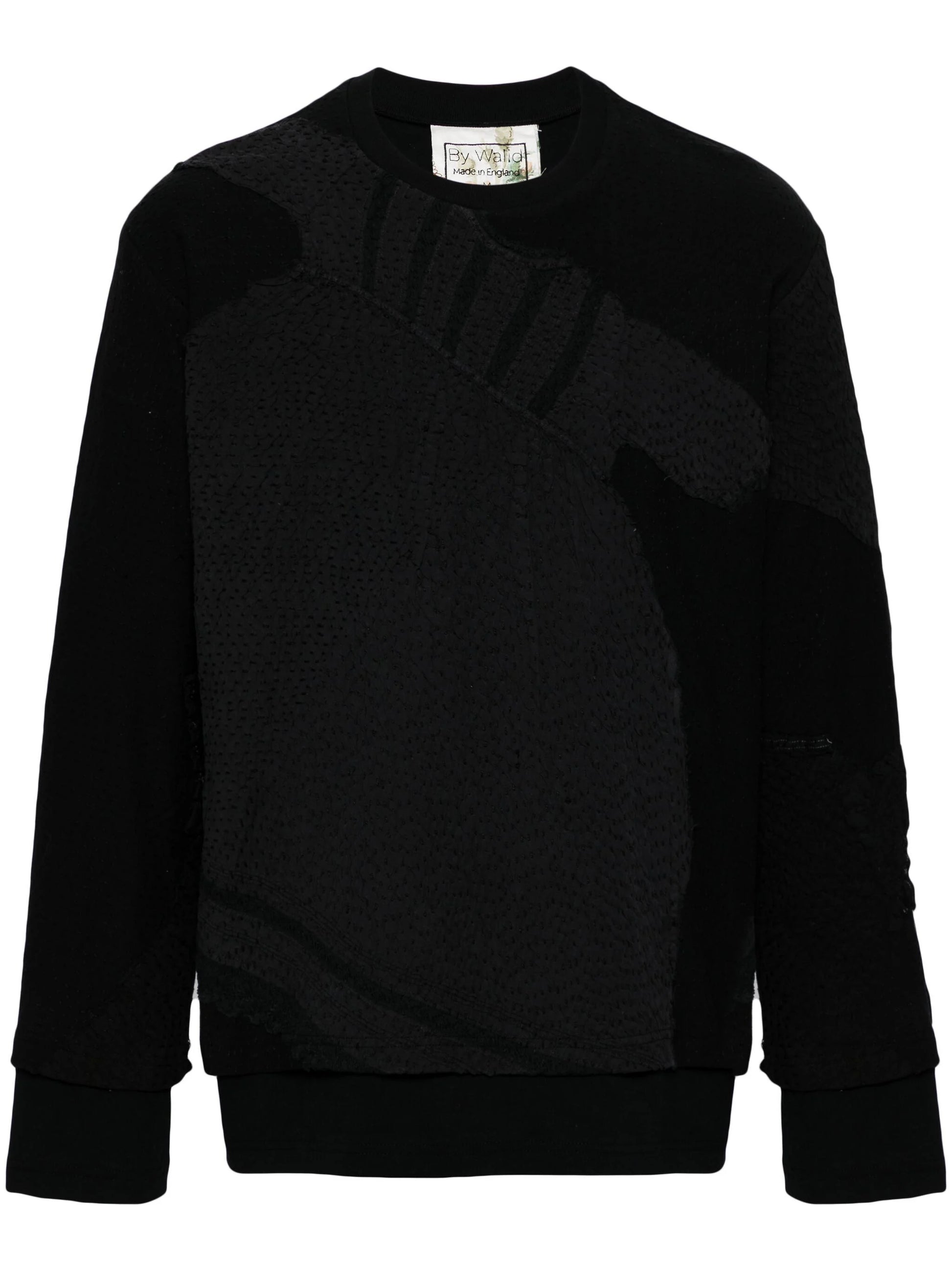 black cotton panelled design crew neck drop shoulder long sleeves straight hem