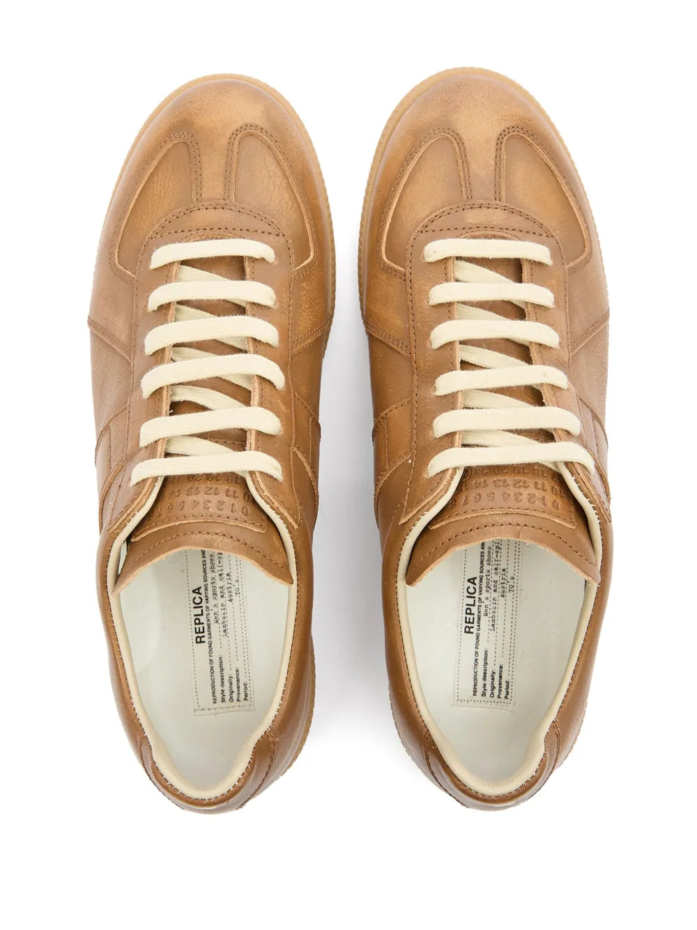Expertly crafted from luxurious cognac brown leather, our Replica Panelled Sneakers exude both style and comfort. Featuring a signature single-stitch logo, front lace-up fastening, and an almond toe design, these sneakers are perfect for any casual or athletic outfit. With a flat rubber sole, you can confidently walk or run with ease. Upgrade your shoe game with these must-have sneakers.