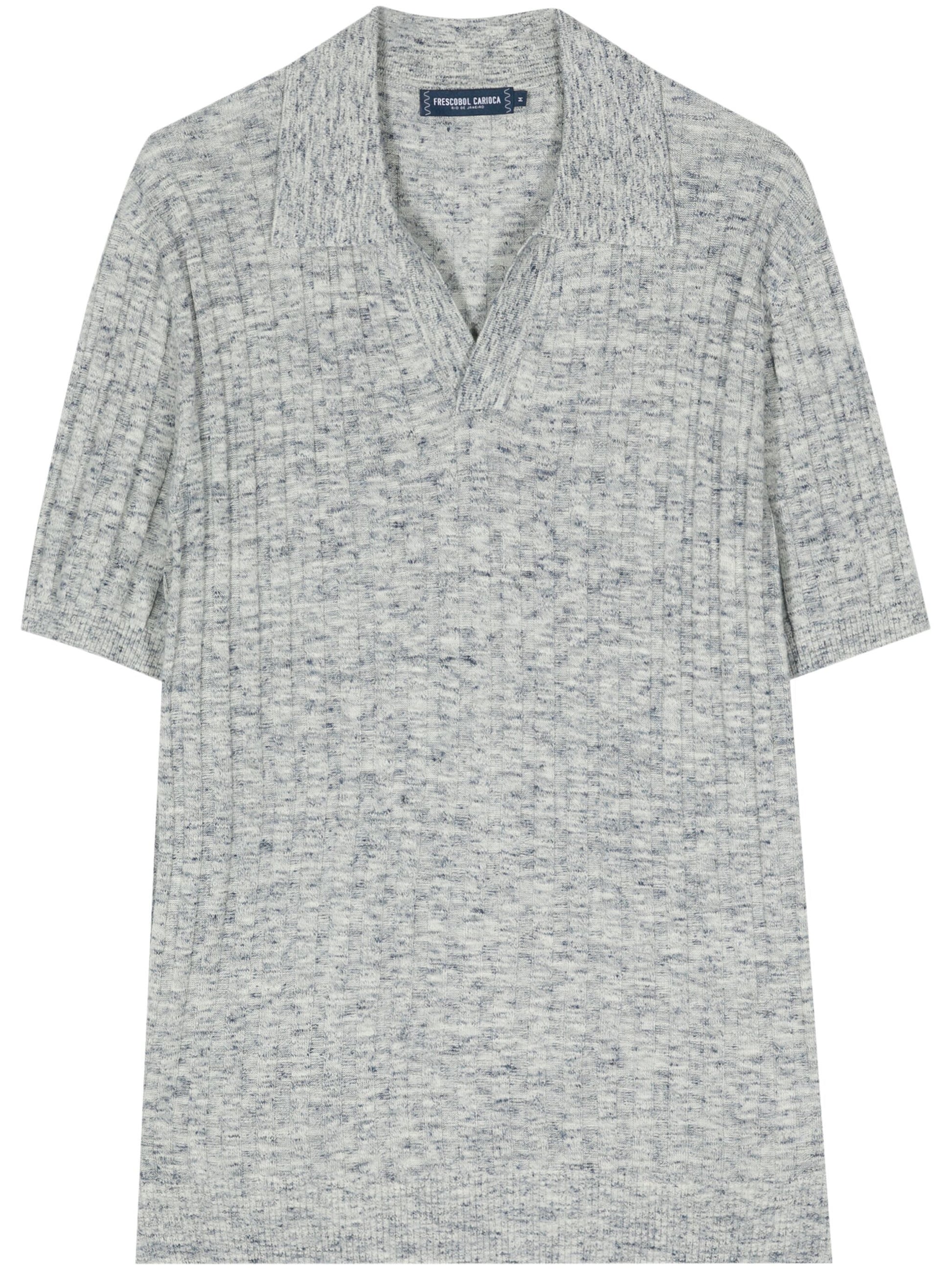 blue-grey cotton-linen blend mélange effect ribbed knit polo collar short buttonless placket short sleeves straight hem