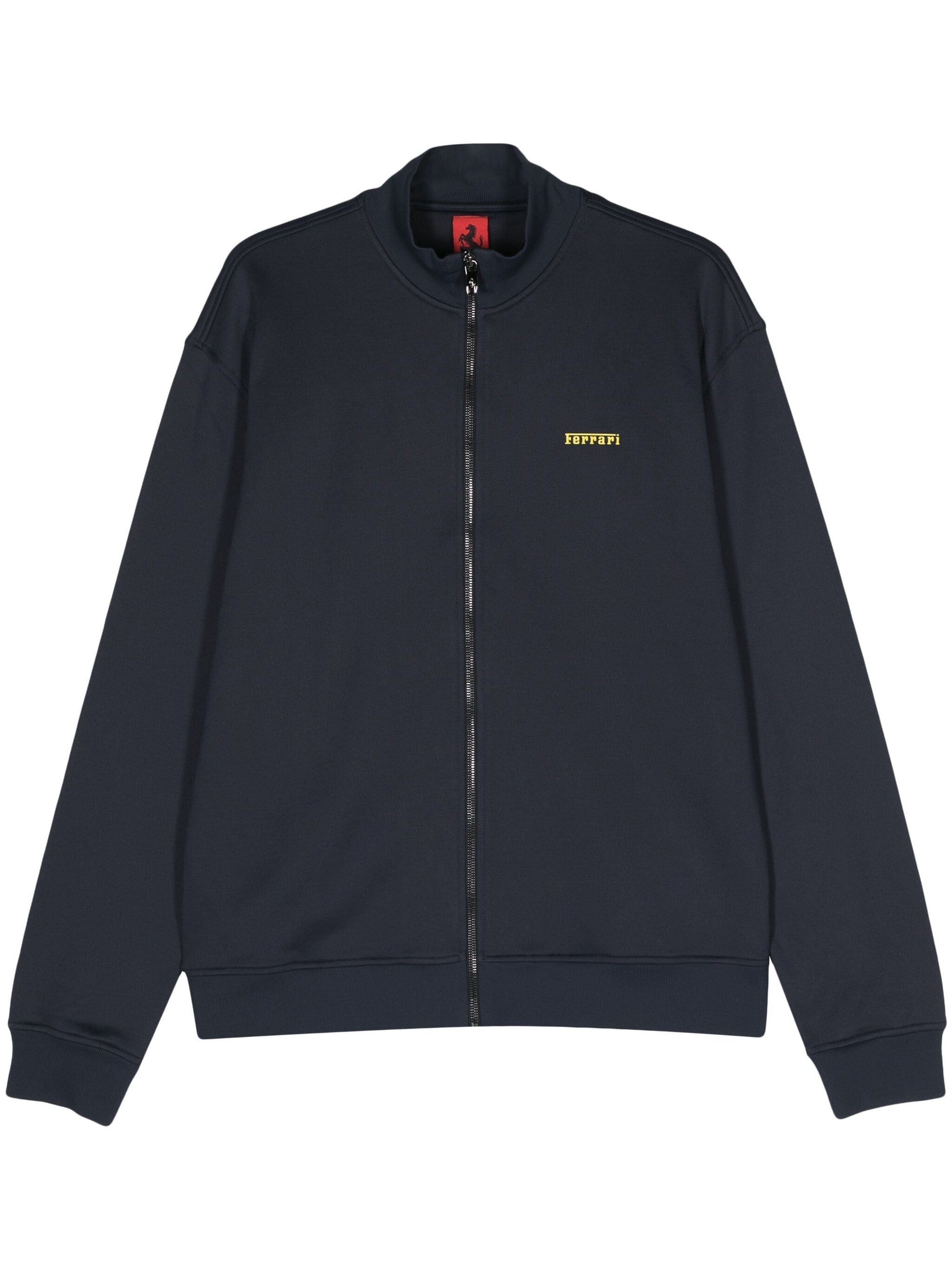 navy blue jersey texture rubberised logo detail ribbed trim baseball collar front zip fastening long sleeves straight hem