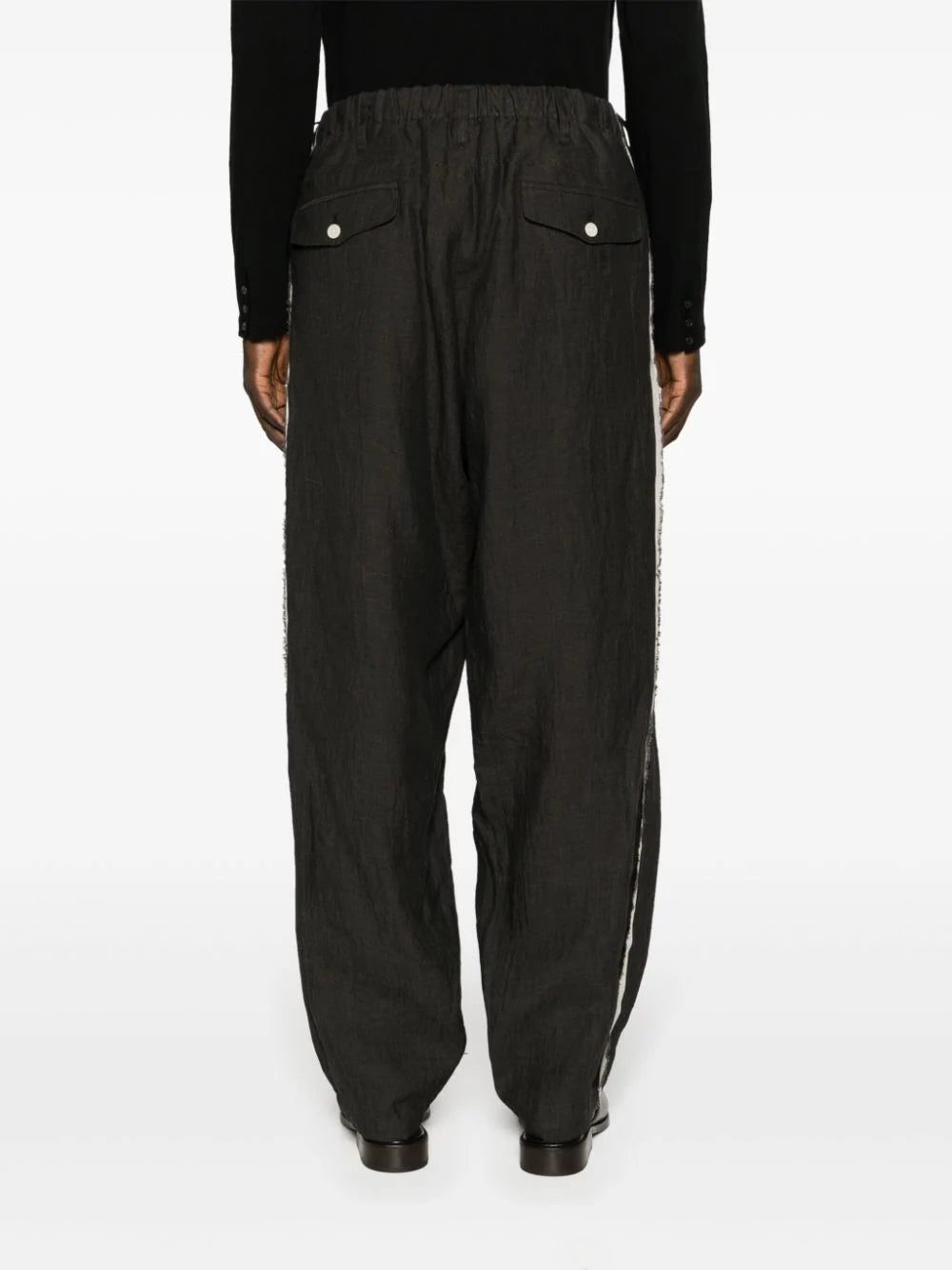 black/white ramie seam detailing elasticated waistband belt loops front button and zip fastening tapered leg two side slit pockets two rear button-fastening pockets straight hem long length