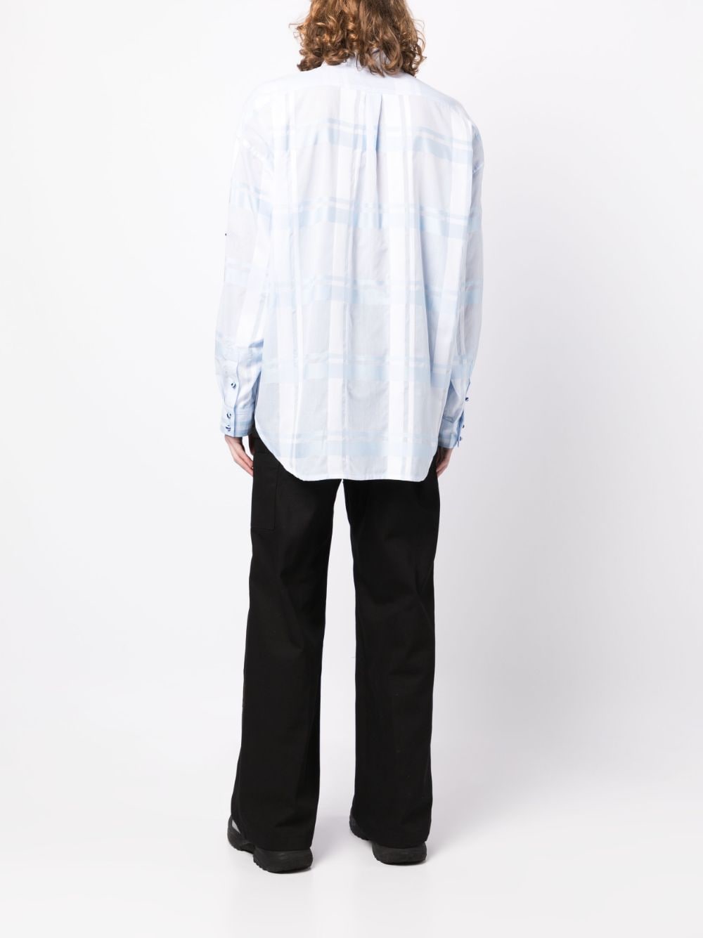 semi-sheer plaid cotton shirt from GmbH featuring ice blue, cotton, semi-sheer construction, plaid check pattern, chest patch pocket, classic collar, front button fastening, long sleeves, buttoned-cuff sleeves and curved hem.