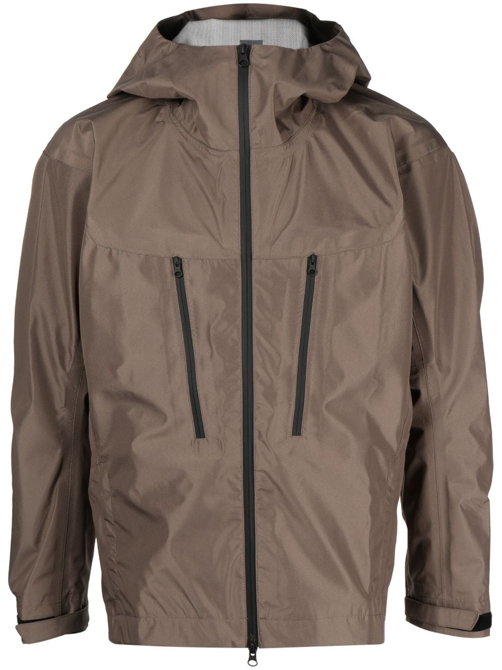 slouchy-hood long-sleeve jacket from GR10K featuring coffee brown, stand-up collar, slouchy hood, front zip fastening, front zip fastening pockets, long sleeves and rear curved hem.