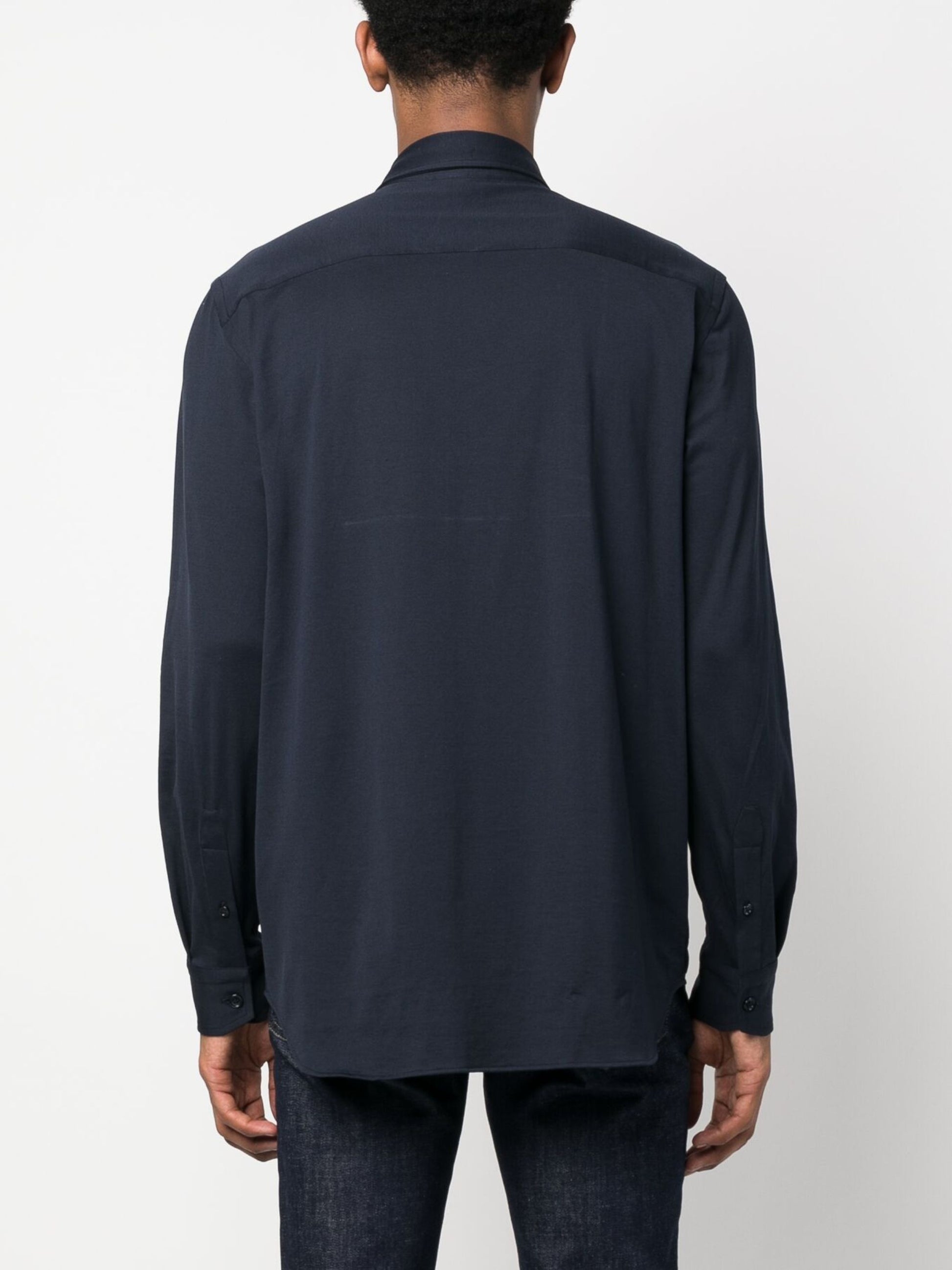 This navy blue cotton shirt features a spread collar, front button fastening, and long sleeves with buttoned cuffs. The curved hem adds a touch of style and versatility to this classic piece. Perfect for a casual yet put-together look, this shirt is a must-have addition to any wardrobe.