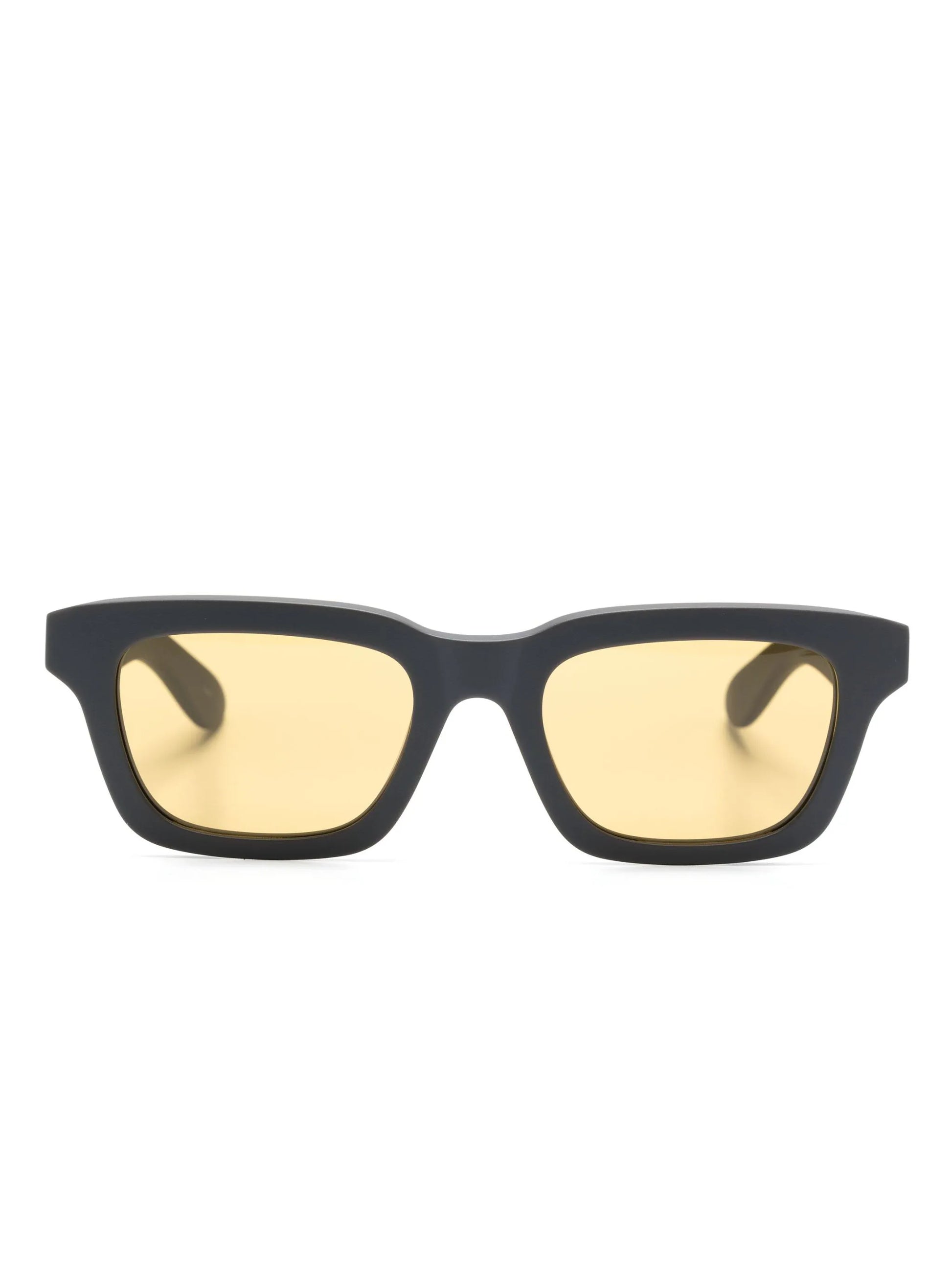 dark grey acetate yellow tinted lenses square shape debossed logo to the side straight arms curved tips These glasses come with a protective case.