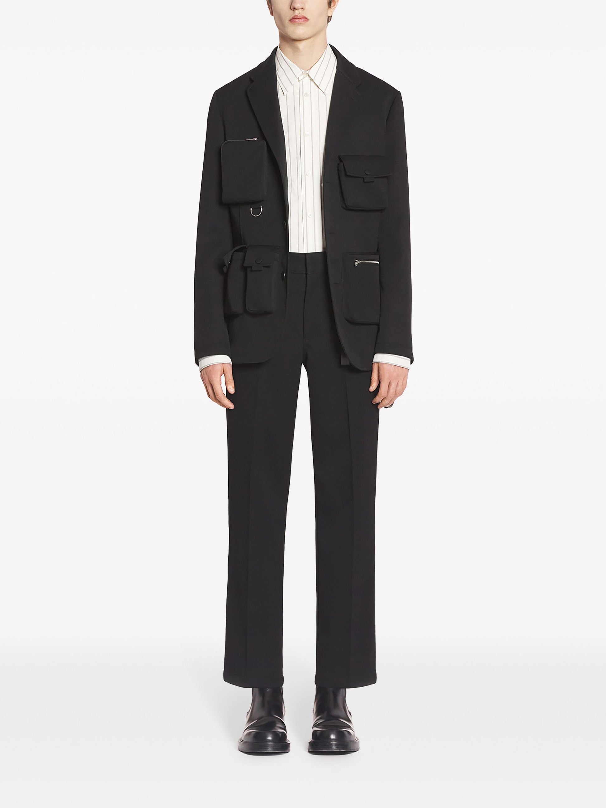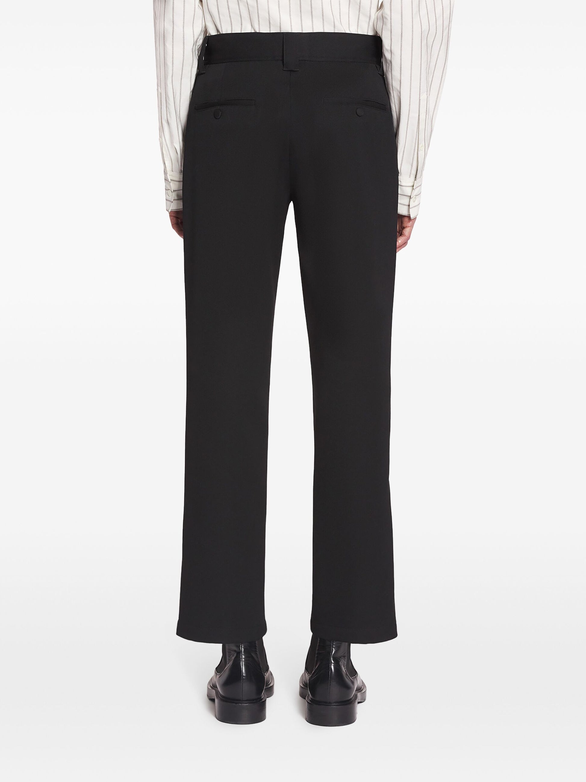 These black straight-leg trousers are perfect for any occasion. They feature a concealed rear hook and zip fastening, belt loops for added style, and pressed creases for a polished look. The two rear welt pockets provide functionality and convenience. Elevate your wardrobe with these must-have trousers.