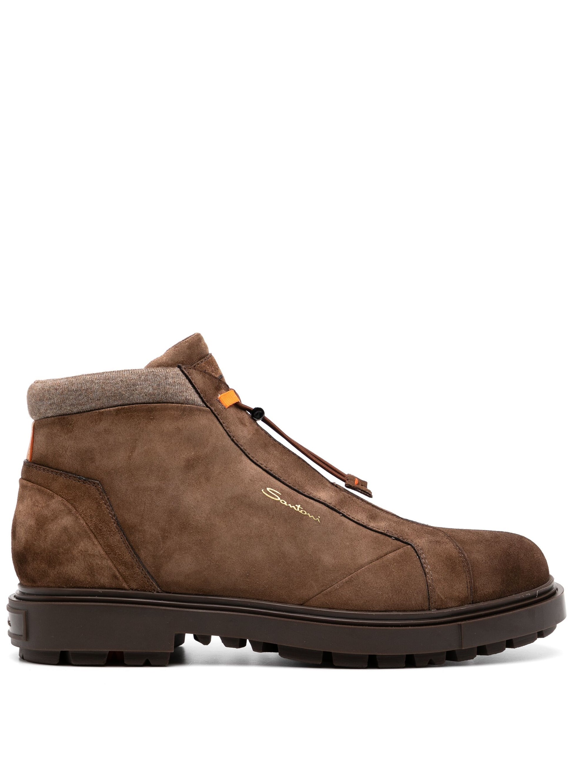 Expertly crafted for ultimate comfort, these brown suede ankle boots feature a drawstring fastening and padded ankle for a secure fit. The brand's logo is subtly printed on the side, adding a touch of sophistication. Designed with a round toe and chunky rubber lug sole, they provide both style and durability.