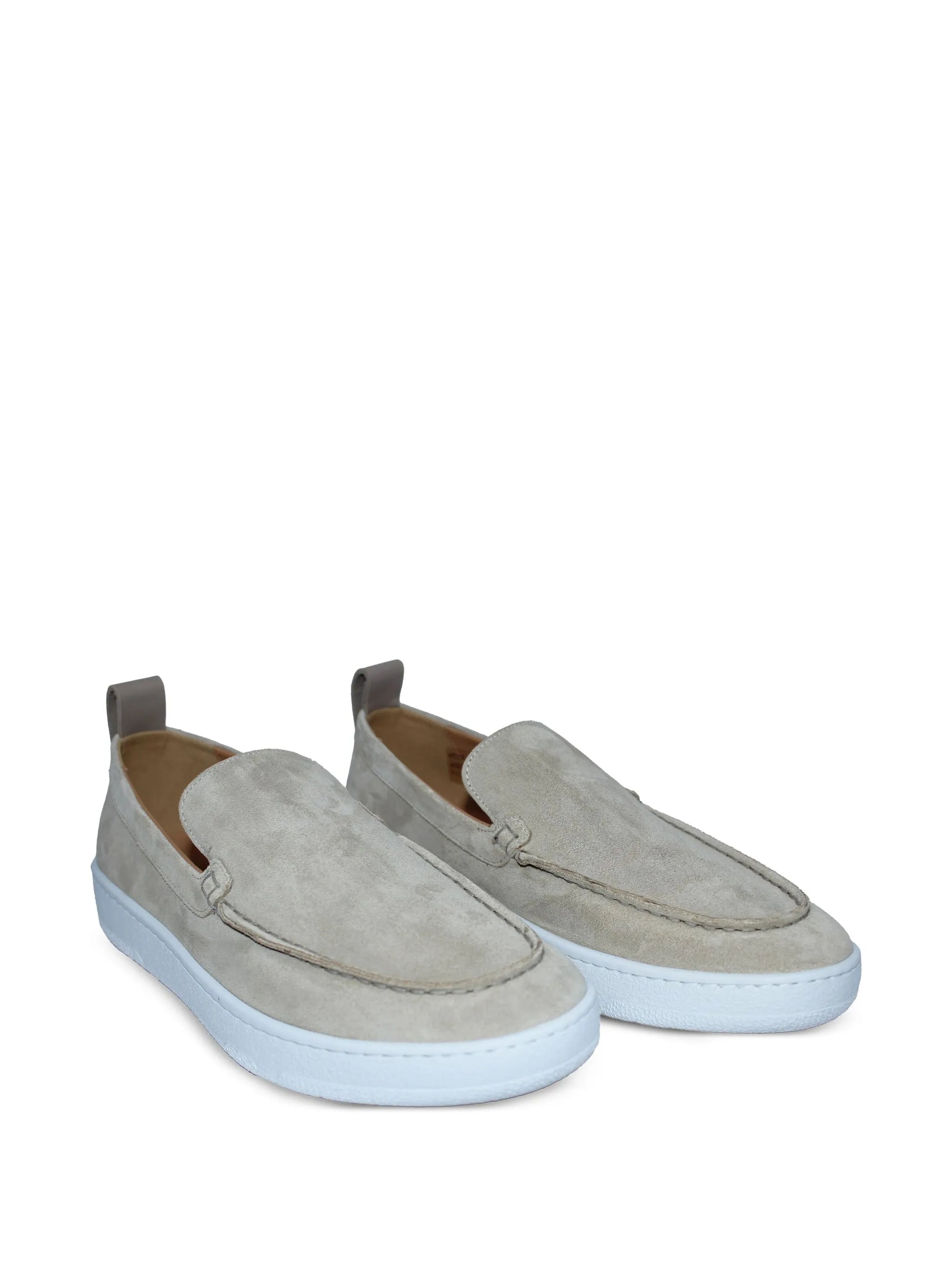 These light beige suede loafers are crafted from premium calf suede, featuring a classic moccasin toe and convenient slip-on design. The flat sole ensures comfortable wear, making them an elegant yet practical choice for refined everyday footwear.